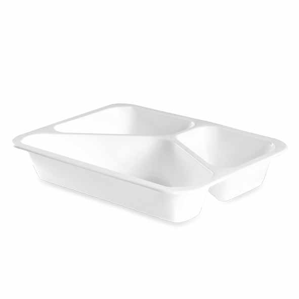 La barquette plastique plat 3 compartiments polypro blanc est une barquette alimentaire en composée de polypropylène qui possède la particularité de pouvoir aller au micro-ondes.