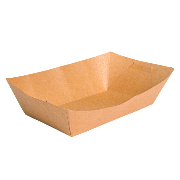 Barquette bateau en carton recyclable kraft brun (250 g/m² + PP) d’une contenance de 960 ml et de dimensions 248x170x60 mm.