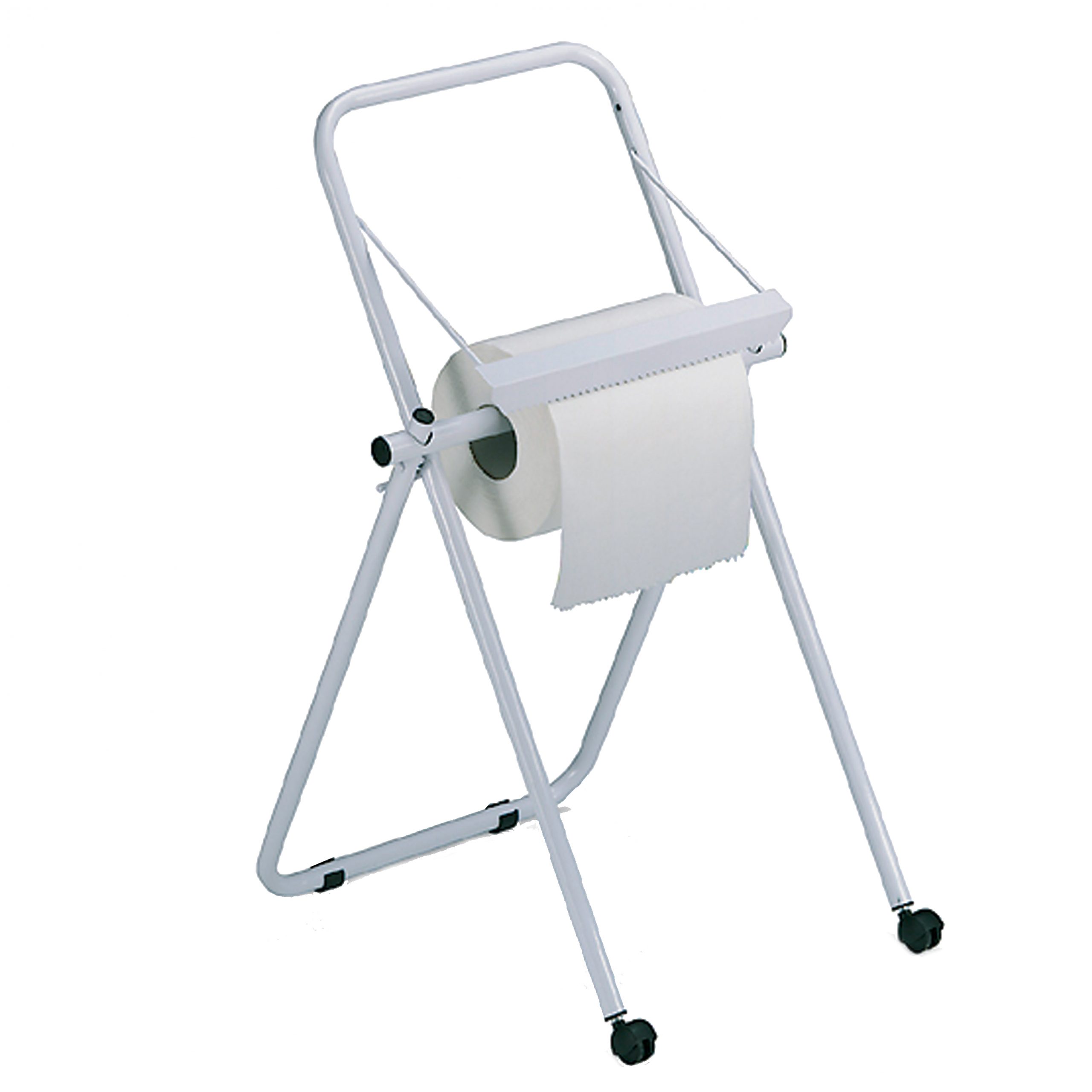 Support rouleau papier mobile avec roulettes en acier peinture époxy blanche.