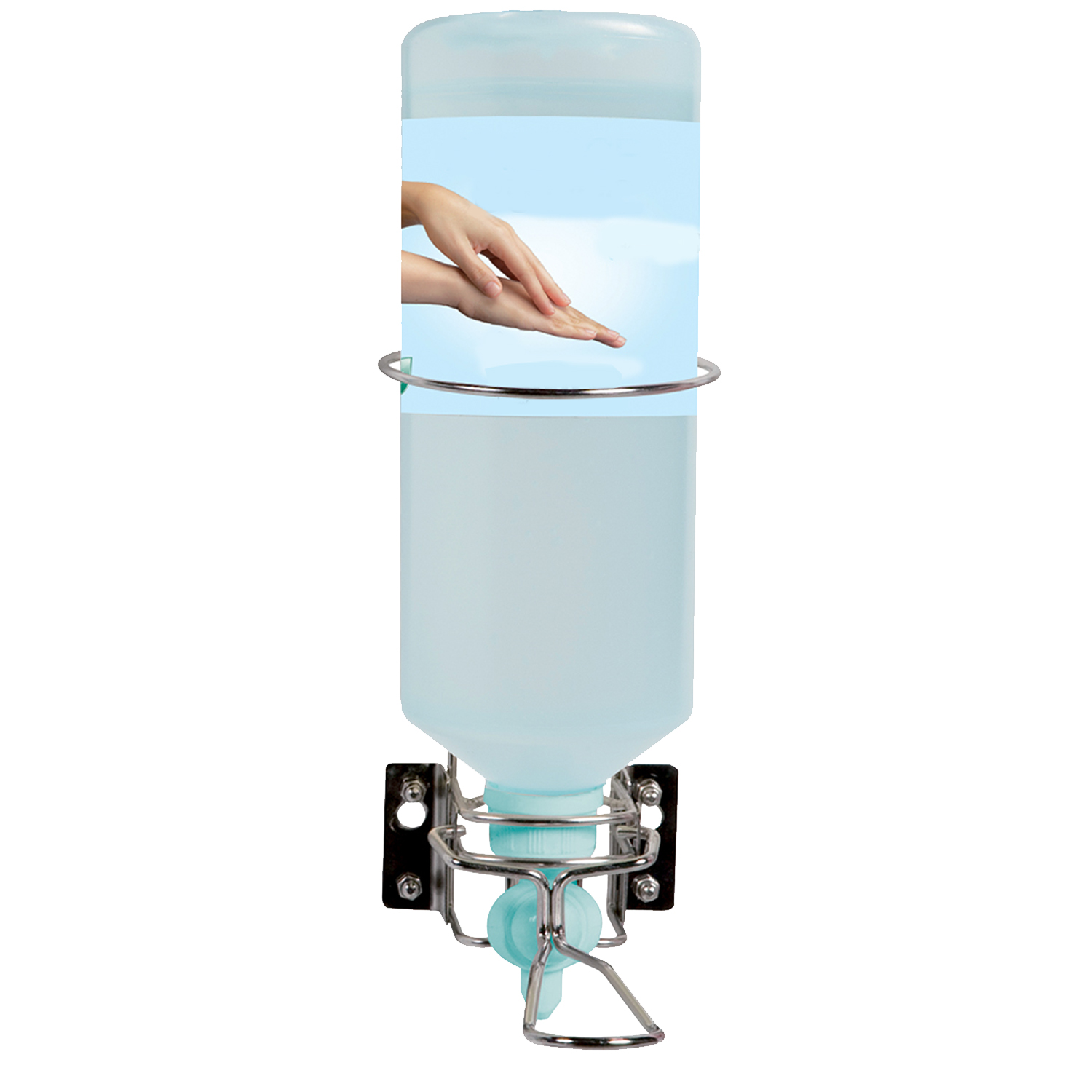 La commande à coude facilite sa manipulation. Cela offre un niveau d’hygiène élevé. Le flacon est maintenu sur le support et se change très facilement.