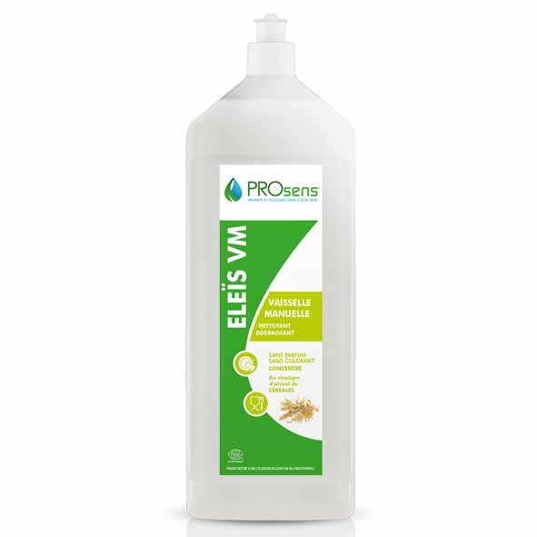 ELEIS VM est un liquide vaiselle manuelle. Nettoyant dégraissant, sans parfum, sans colorant et sans allergène.