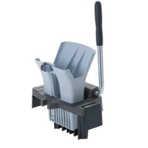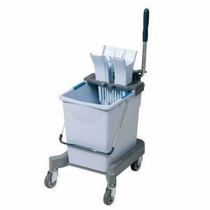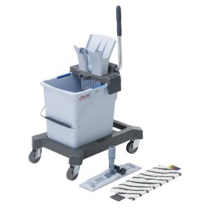 Le kit se compose d’un seau de rinçage de 25 litres doté d’un code couleur bleu, d’un châssis sur roulettes, d’une presse à levier, d’un support de lavage.