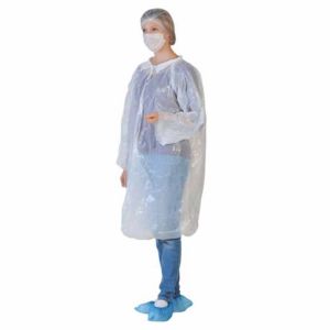 – une blouse en polyéthylène avec 3 boutons pressions, col classique, sans poche – taille unique.