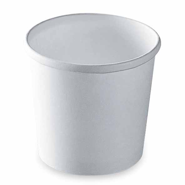 Pot à soupe, ou à crème, à sauce ou à glace en carton blanc apte au contact alimentaire direct d’une contenance de 355 ml.