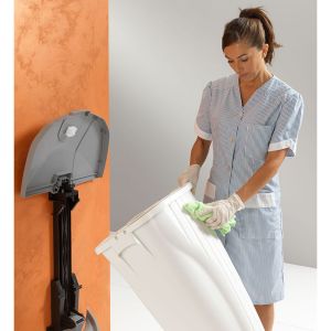 Oyster est également équipé d’un système de verrouillage/déverrouillage qui permet de le bloquer sur son support afin d’empêcher toute chute accidentelle, de le déverrouiller pour vider les déchets ou pour le nettoyer.