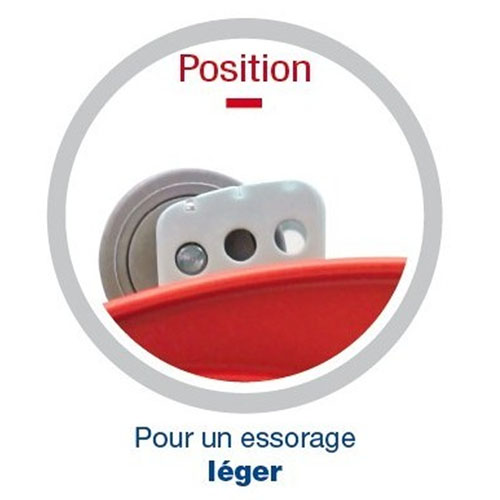 Rouleau réglable : peut être facilement adapté aux différents besoins d’essorage. L’emplacement central permet un essorage standard, la position «-» un essorage léger et la position «+» un essorage énergique.