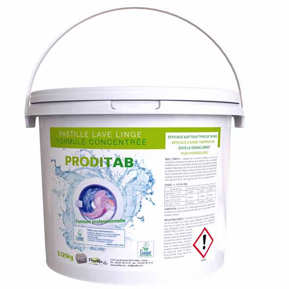 La pastille lave linge Ecolabel Prodifa est une lessive professionnelle formulée sans phosphates.