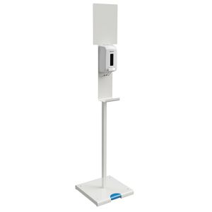 SANIMAINS Station de désinfection des mains à pédale sur pied blanc, sans contact pour tous les lieux accueillant du public (écoles, hôpitaux, entreprises, centres commerciaux…