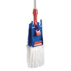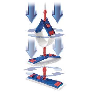 Pour le rinçage et l’essorage de la frange il suffit de faire pression avec le pied sur le bouton rouge, le support se ferme à 180 ° et la frange reste accrocher au support.